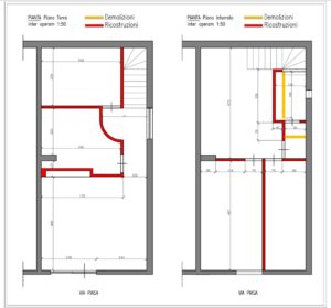 Si è iniziato dalla progettazione su carta degli spazi interni, in funzione delle esigenze che il tipo di attività richiede. Dopo diverse ipotesi di disposizione interna, si è giunti al progetto finale.
